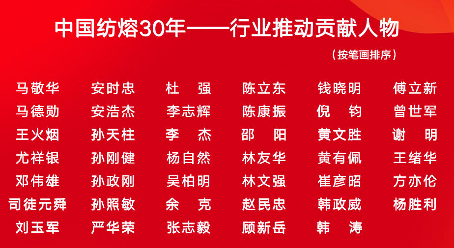 纺粘分会成立30年,也是中国纺丝成网行业砥砺前行的30年。行业的蓬勃发展,得益于众多企业家日复一日的耕耘与创新。在纺粘分会成立三十周年之际。分会发布了“中国纺熔30年——行业推动贡献企业与个人”荣誉榜单。向所有为行业发展做出卓越贡献的企业及个人致以崇高的敬意。