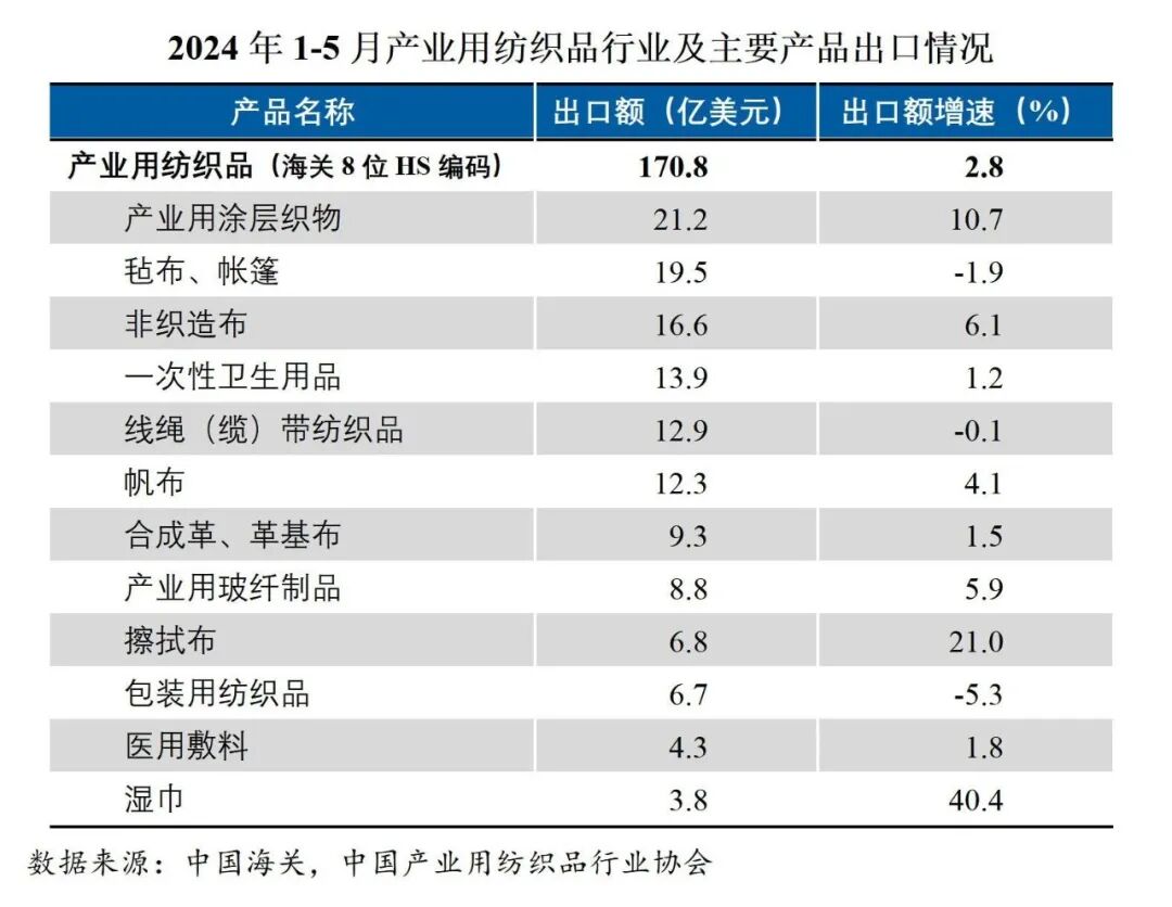 分领域看,1-5月非织造布行业规模以上企业的营业收入和利润总额分别同比增长4.4%和23.7%,企业利润恢复明显加快,营业利润率为2.4%,同比增长0.4个百分点;绳、索、缆行业规模以上企业的营业收入和利润总额分别同比增长24.4%和21.6%,营业利润率为3.2%,同比微降0.1个百分点;纺织带、帘子布行业规模以上企业的营业收入和利润总额分别同比增长7.2%和27.9%,营业利润率为2.6%,同比增长0.4个百分点;篷、帆布行业规模以上企业的营业收入同比下降0.7%,利润总额同比增长3.5%,营业利润率为5.8%,同比增长0.2个百分点;过滤、土工用纺织品所在的其他产业用纺织品行业规模以上企业的营业收入和利润总额分别同比增长13%和60.6%,7%的营业利润率为行业最高水平,同比增长2.1个百分点。国际贸易方面,根据中国海关数据(海关8位HS编码统计数据),2024年1-5月产业用纺织品行业出口额达170.8亿美元,同比增长2.8%;进口额为20.2亿美元,同比下降6.2%。分产品来看,产业用涂层织物是行业出口金额最高的产品,前五个月出口额达到21.2亿美元,同比增长10.7%;毡布/帐篷的出口额紧随其后,为19.5亿美元,同比下降1.9%;非织造布的出口量达到60万吨,价值16.6亿美元,分别同比增长18.4%和6.1%;一次性卫生用品(尿裤、卫生巾等)的出口额为13.9亿美元,同比增长1.2%,其中成人失禁用品的出口额同比增长15.1%;传统产品中,产业用玻纤制品和帆布的出口额同比增长5.9%和4.1%,革基布的出口额增幅收窄至1.5%,线绳(缆)带纺织品出口额较2023年同期基本持平,包装用纺织品的出口额降幅有所收窄;擦拭品类的出口需求旺盛,擦拭布(不含湿巾)和湿巾的出口额分别为6.8亿美元和3.8亿美元,分别同比增长21%和40.4%。