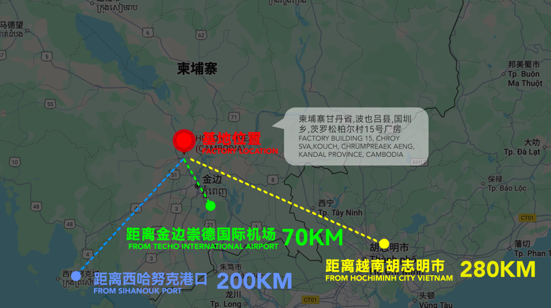 厂区位于柬埔寨干丹省5号公路;立足金边经济圈,贯通国际物流动脉。