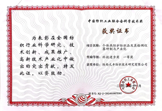 2024年度中国纺织工业联合会科学技术奖于近日揭晓。由陕西元丰新材料科技有限公司(原陕西元丰纺织技术研究有限公司)、西安工程大学、泰和新材集团股份有限公司、优普泰(深圳)科技有限公司、四川大学、天津工业大学共同完成的“个体热防护纺织品及其检测仪器研制与产业化”项目荣获中国纺织工业联合会科学技术奖一等奖。